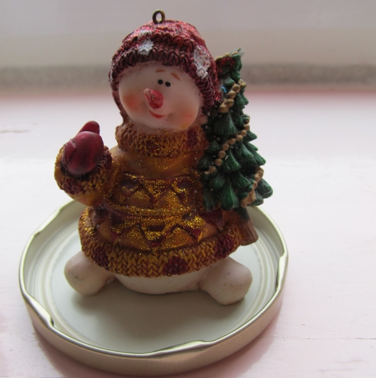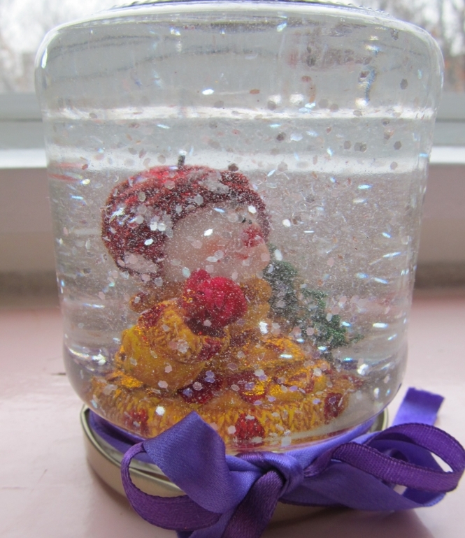 Хорошо моем банку, выливаем туда глицерин с водой в пропорции 1:1 (чем больше глицерина, тем дольше снежинки кружатся), насыпаем блёстки (иногда насыпают молотую яичную скорлупу, но мне не понравился эффект). На крышку (с внутренней стороны) приклеиваем нашу игрушку. Аккуратно завинчиваем (банка должна быть наполнены не до самых краёв, т.к. игрушке тоже нужен объём). Если банка не герметична, то можно замазать края герметиком. ВСЁ. Наслаждаемся