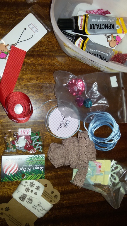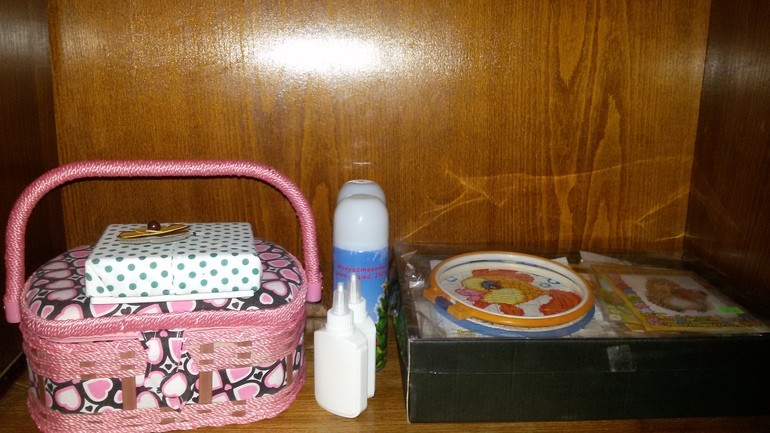 Внизу столика расположились: шкатулка для вышивки-очень удобно хранить ниточки и иголки-вышивальщицы поймут), выше -это моя собственно придуманная коробочка для ниток в дорогу! :))клей и балончики с искусственным снегом и коробка с заготовленными вышивками). Не стала всё доставать,очень много)) Закупаюсь впрок!
