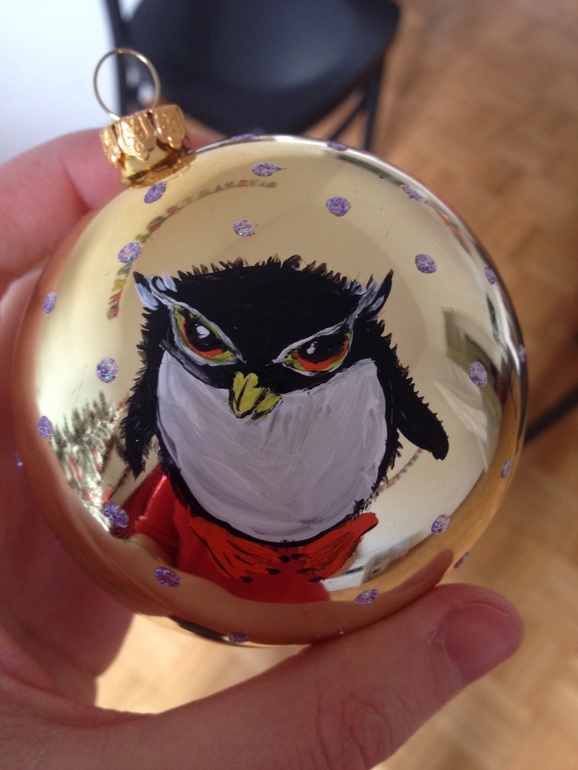 Решила поздравить своих учителей на курсах французского языка и дочкину учительницу во французской школе. Сделала пока один шарик учителю и один Машиной однокласснице, у которой был недавно день рождения (5 лет). Картинки срисовала из интернета. Но мне очень понравилось заниматься росписью! Всем рекомендую перед новым годом :-) Я покупала пустые ( без картинок) шарики и акриловые краски, и еще клей с блестками.