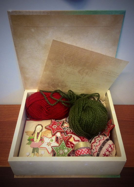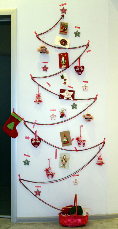 Если взять коробку с нитками, открытками, игрушками и приклеить все это на скотч, то можно сделать елку