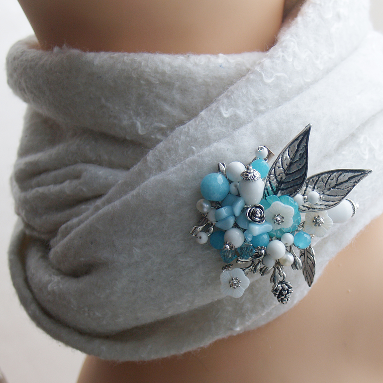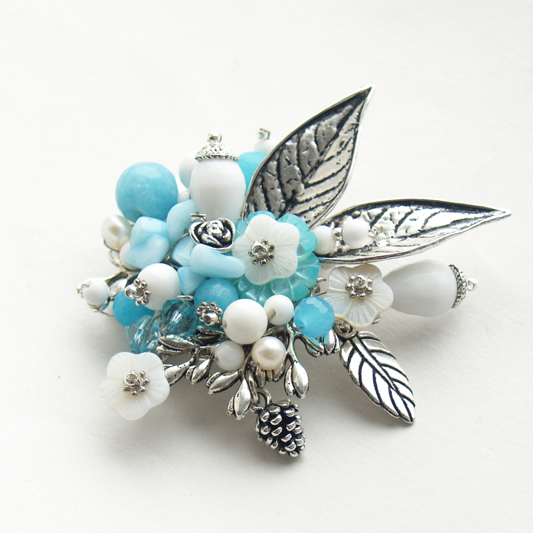 Бижутерия для слингомам. Слингобусы. Грызунки.Эта брошь - настоящее чудо! В ее композиции использовано столько красивых и разнообразных элементов! Агатовые бусины голубыхоттенков, кусочки каменной крошки, резные перламутровые цветы, капельки белого агата, жемчужинки, декоративные розочки, листики, шишечки...