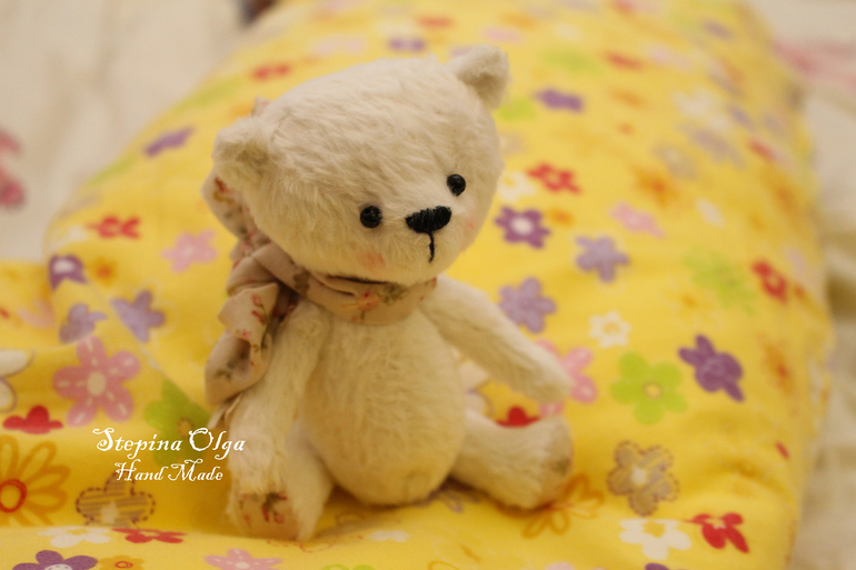 Сшит из немецкой вискозы, набит холлофайбером и ниточное крепление, ножки и ручки двигаются, пока я только постигаю процесс изготовления теддиков, и тонировку, поэтому это пробный мой первый Мишуля). Бантик перешью) т.к. это просто кусок ткани завязанный в бант