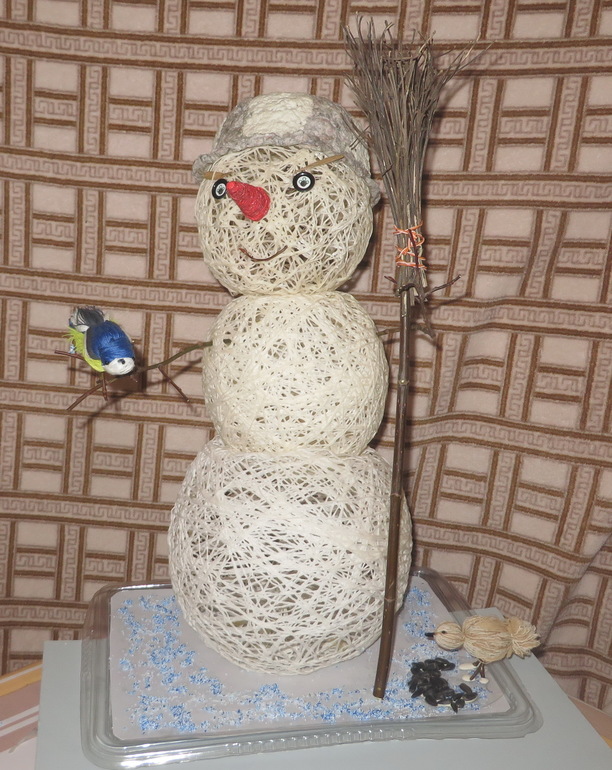 Поделки с детками.Неделю лепим снеговика. Еще снег на улице отсутствовал, а мы уже накатали снежные шары из ниток. И с прошлого воскресенья каждый день по чуть-чуть добавляем. Коллективно. В итоге сейчас досыхает вот такое чудо.