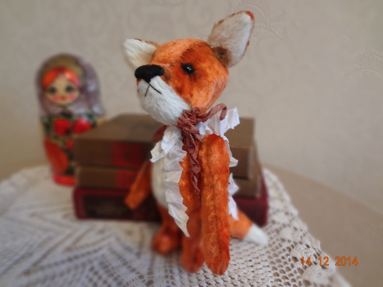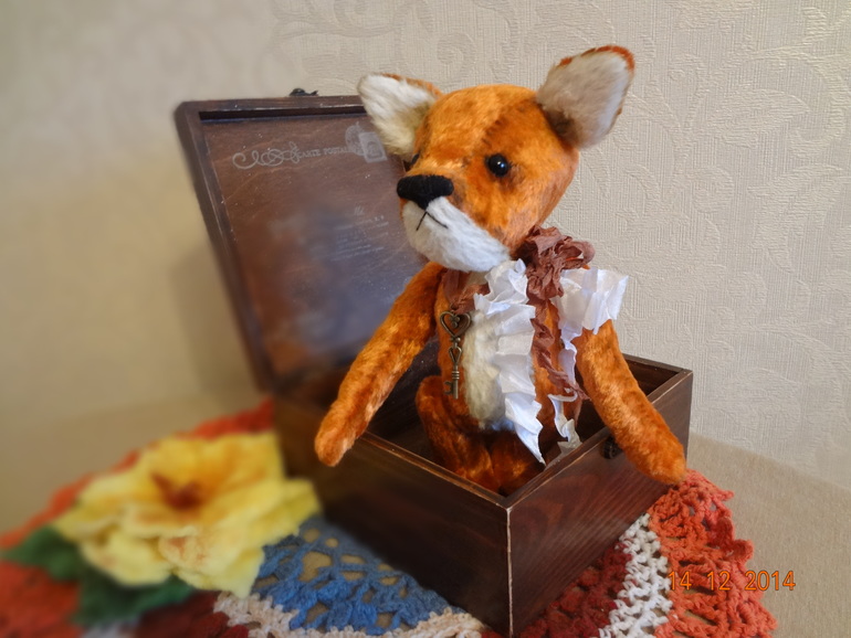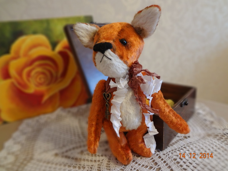 Игрушечный мир - животныеДавно хотела сшить такого лисенка,но все никак до него руки не доходили.. и вот можно сказать на одном дыхании он появился. Получился таким ярким и рыжим!!! Сшит полностью вручную из винтажного рыжего плюша и белой немецкой вискозы. Набит плотно опилочками,утяжелен металлическим гранулятом,получился таким тяжеленьким,имеет приятный вес))).Голова на шплинтовом креплении,крутится,ручки и ножки тоже на шплинтах,подвижны. Лисенок слегка тонирован масляными красками. Глазки стеклянные. Ша шее висит ключик,украшен шебби лентами.