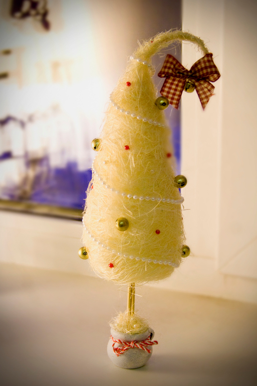 - В садик сделала елочку из белого кружева. Только без горшочка и сверху с лентой что бы можно было повесить.