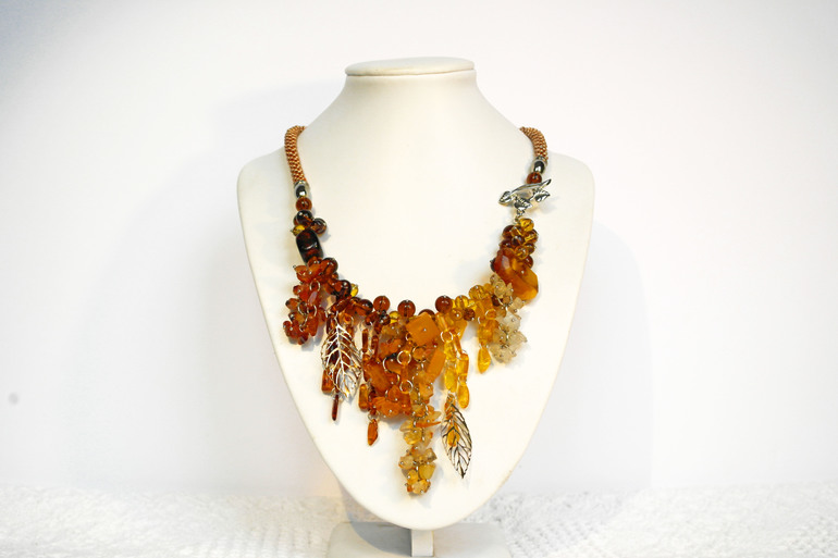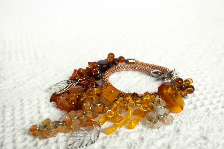 На самом деле это все янтарь, у него такие сладкие осенние цвета, что невозможно было добавить что-то другое. Итак, янтарь, красный агат, стеклянные бусины, бисер огонек медного цвета - пышное природы увядание. И немного инея - фурнитура под серебро.