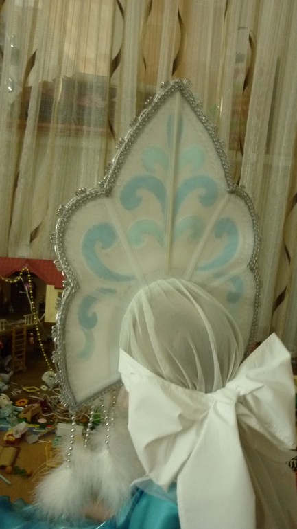 Из картонной коробки для обуви(картон должен быть тонкий, но жесткий, не сгибаться и по цвету быть белым, хотябы с одной стороны) вырезала внутренний обод и пристрочила его по низу к лицевой части кокошника белой стороной вниз(т.к. цветную сторону не будет видно, на нее наклеится пух). Из фатина вырезала произвольный прямоугольник, можно квадрат, скруглила углы-это фата сзади, которая подхватывается бантом. Бант из тонкой плащевки, хорошо держит форму. Узоры я вырезала и фетра, фетр,пайетки и пух клеила при помощи клея момент гель. Тесьму по краю и бусы-при помощи горячего пистолета.