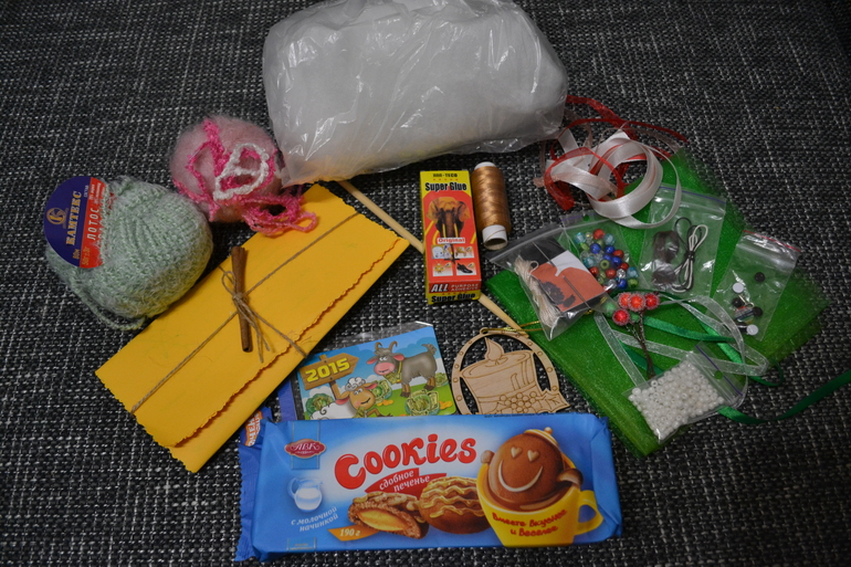 Итак, помимо заявленого слоника, в который входил: Набор для создания вязаного медвежонка на ниточном шарнире!: фактурная пряжа с имитацией меха, крючок нужного размера, синтепон, палочка для набивания наполнителя,три пары глазок, суперклей, нить для "ниточного крепления", игла, нить для вышивания носика, ленточки для украшения трех цветов, два вощеных шнура, подвесочки на шею мишке, "липучка" для начесывания шубки отрез органзы для упаковки подарочного мишки!а также моточек королевского мохера для создания персидского котика и атласная брошь, ну и само подробное описание вязания мишки)))), мне досталось ещё огромное количество бусинок, ленточек, ягодки для украшения новогоднего мишки, а ещё магнитик с символом наступающего года, подвесочка на ёлку в виде свечи - домашнего очага и ещё вкуснючие печеньки со смайликом))) а ещё был цветочек (он не попал в кадр), я так поняла из него можно сделать либо брошку либо прикрепить к резиночке для волос)))