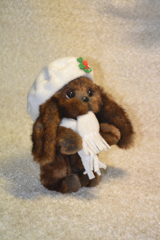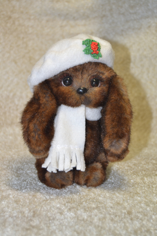 Зайка Шоколадка. Рост 16 см. Сшит из искусственного меха (Франция), приятно тяжеленький, головка на двойном шплинте. Стоит уверенно. Берет снимается.