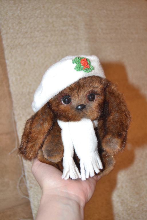 Игрушечный мир - животныеЗайка Шоколадка. Рост 16 см. Сшит из искусственного меха (Франция), приятно тяжеленький, головка на двойном шплинте. Стоит уверенно. Берет снимается.