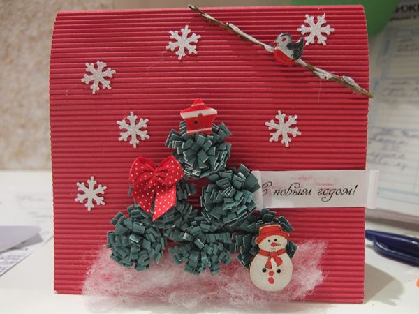 Первая открыточка- с не ровными краями. Следите за этим, зачастую так всегда в начале. Для лучшего обрезания я купила металлическую линейку и нож строительный. Потом, правда, уже резаки появились) Но это всё со временем. Плюс чипборд лучше всё-таки обрабатывать. Не во всех работах он смотрится выигрышно. Здесь бы смотрелось лучше белёный. Нижнюю веточку вообще не поняла. Она мне почему-то напоминает метёлку этакую)))) Лучше там расположить было надпись.Вторая лучше. Основная ошибка в том, что с одной стороны имитация рваного края, а с другой — ровный краешек на центральном разрыве. Опять же чипборд не обработанный, хотя он тут как раз ближе к "имеет право быть", бантик у ёлочки бы поменьше.Третья больше всех нарвиться тоже, самая гармоничная. Единственное- краешек ажурный. Либо лучше, чтоб он был воздушным (чтоб под ним ничего не было), либо надо было уж два уголка делать))))