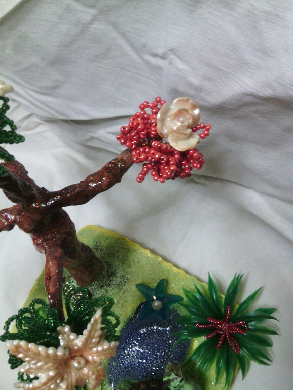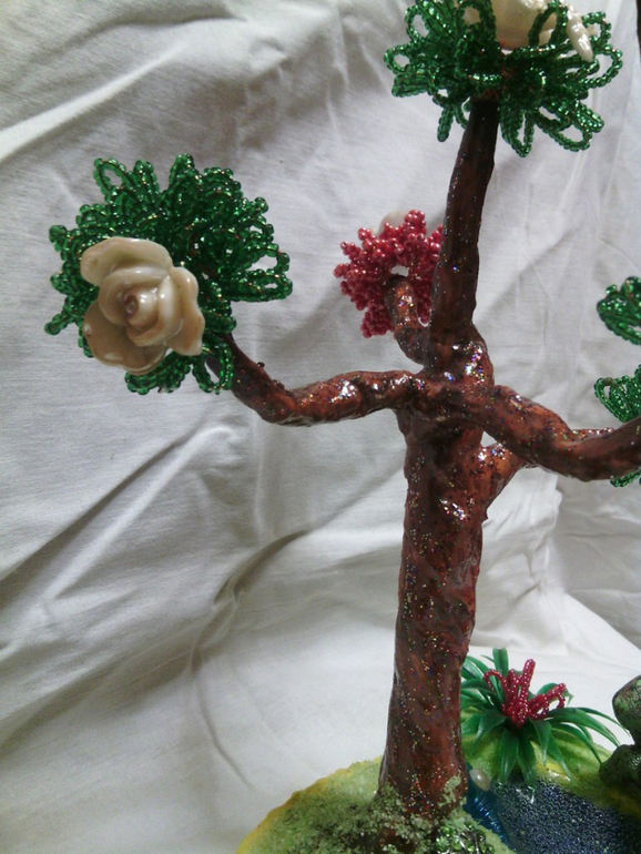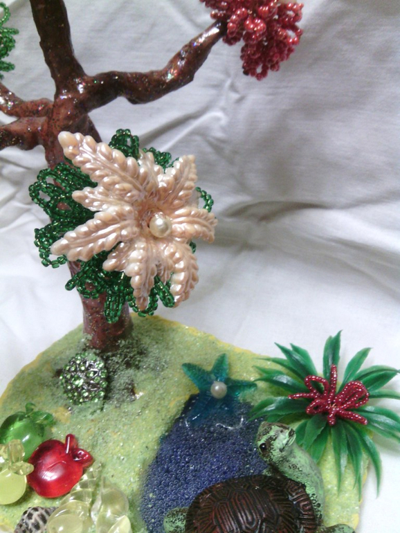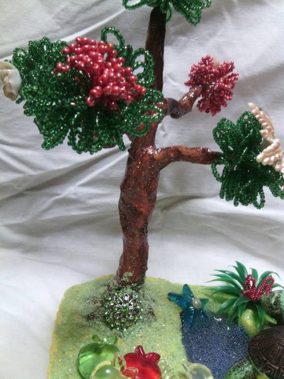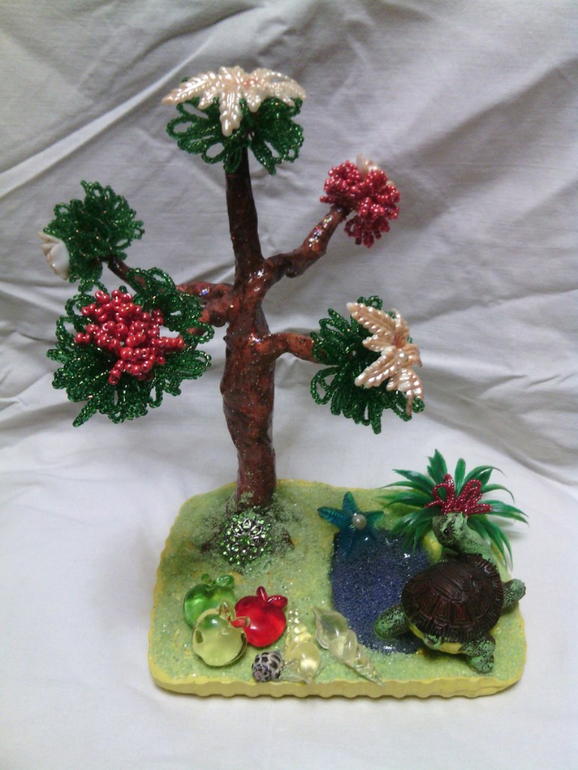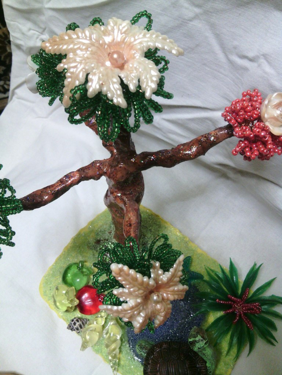 Бисер. Бисероплетение. Украшения из бисера.Всем привет!Давненько я тут не появлялась,с выходом на работу из декрета времени на любимое занятие ооочень мало остаетс((((но тем не менее соорудилась такая композиция...изначально планировался бансай,но порывшись в закромах наткнулась на цветочки от любимых сестричкиных резиночек для волос)))и вот чтоб ей эти цветочки напоминали о детстве я решила их приделать в бансай и вот что вышло))))))