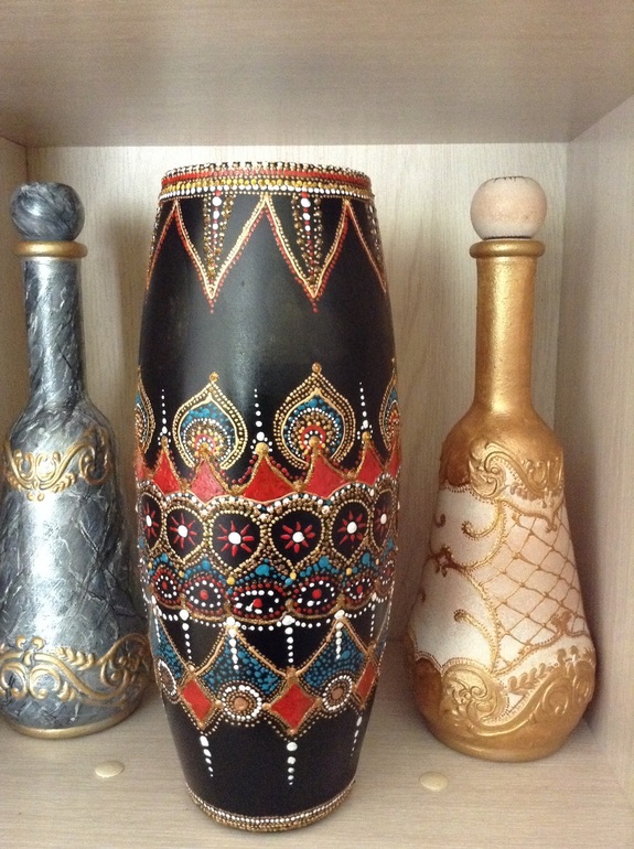 Надоело покупать вазы уже 4 разбили! Я взяла и Расписала банку! Пока стоит!