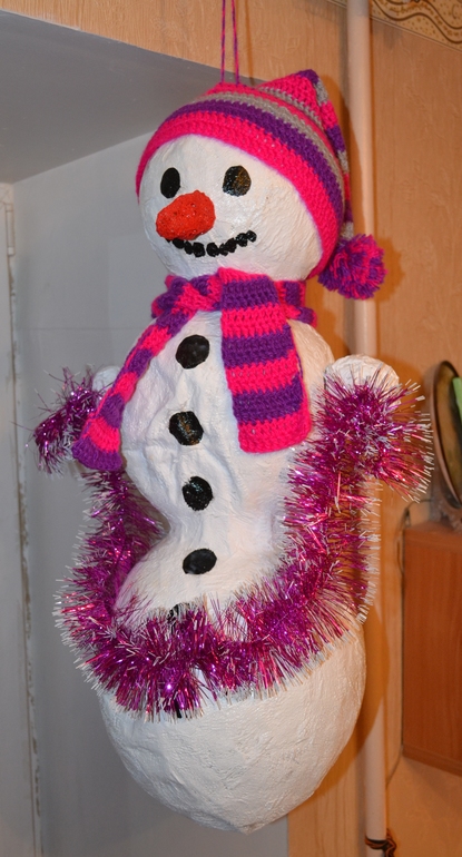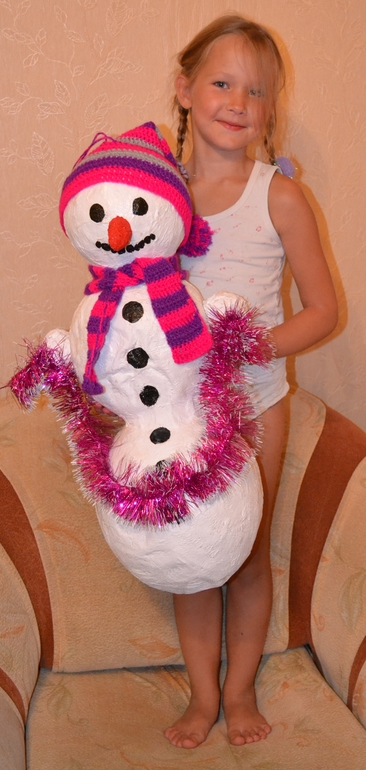 Как оказывается давно я на "баловалась" техникой "папье -маше"... Сколько нелестных слов услышал от меня Снеговик в стадии своего рождения))) Но когда приехала Софья и узнала, что СТРАШНЫЕ (обклеенные газетой) ШАРЫ висящие на гардине - это будущий Снеговик, то она очень обрадовалась и стала активно помогать...