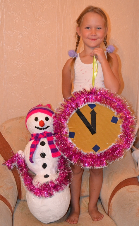 Мне даже пришлось шапку и шарф связать специально для этого случая))) Самое страшное смешное было когда все три шара были склеены и опять повешены на гардину... Вот видок в окне был, причем размерчиком с пол окна)))) Пока Снеговик сох, мы умудрились сделать ещё три (!!!!) игрушки: Ёлку, Колокольчик и Часы... К сожалению, первые два уже унесли без фотосессии, но чтобы увидеть масштаб бедствия размер игрушек сфотографировала их рядом с Софьей)))) Сын был в шоке: "Мама, ну куда тебя опять понесло-то?" Куда, куда... На Ёлку))))