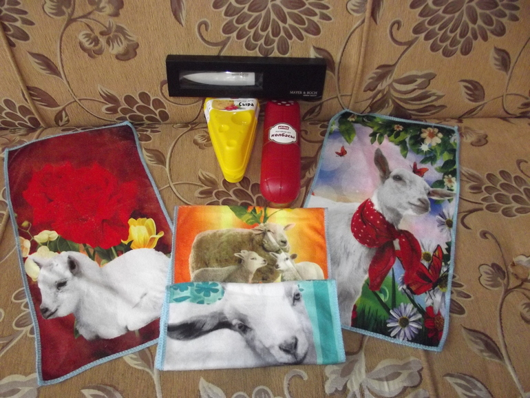 Подарочки были предназначены для всех членов нашей семьи.Для меня и мужа .Контейнеры для хранения сыро-колбасных изделий,керамический нож,милые салфеточки