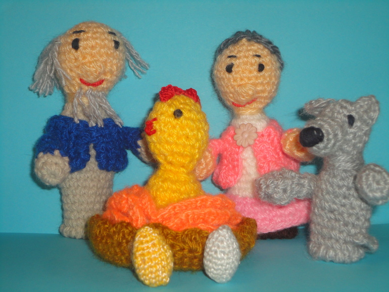 У нас есть уже пальчиковый театр по сказке Три поросенка. Ребенок любит его больше других игрушек. Проигрываем по несколько раз и в разных вариантах. А тут к новому Году поступил заказ на сказку Курочка Ряба. Теперь,думаю,что и себе такой вязать придется,сына не оторвать от него.