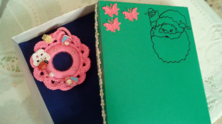 Потом были подарки для деток, оказывается не все сфоткала, но ничего страшного, это для куклы, и обвязанное колечко со сьемными заколками, еще был ангелок, браслетик от Мери кей в другой коробочке