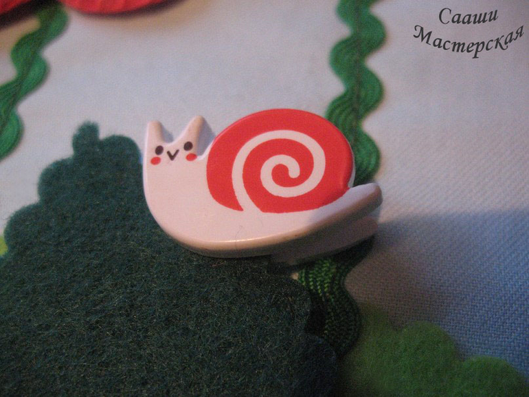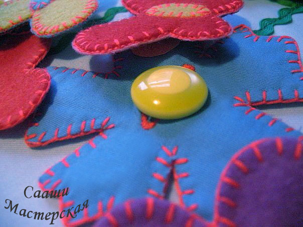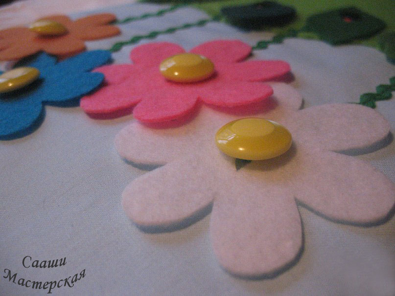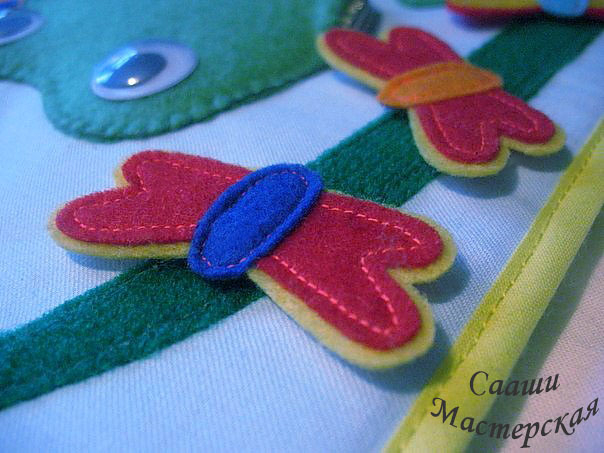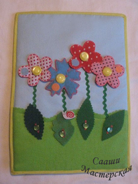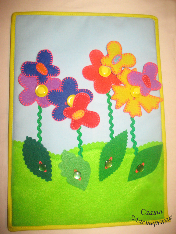 К страничке прилагаются два набора цветов - простые, из одного слоя фетра, отверстие для пуговицы не обметано. Эти цветки предназначены для тех детей, которые только учатся пристегивать цветок к пуговке. Цветки двухсторонние, с обметанным отверстием для пуговицы предназначены для детей, которые уже с легкостью пристегивают однослойные цветки. Имеются два вида пуговок: большие и маленькие. Есть улитка-прицепка, которая позволит малышу отработать щипковый захват. Улитку можно сажать на листики или лепестки цветов. Помимо развития мелкой моторики эта страничка поможет выучить такие цвета, как: желтый, красный, синий, фиолетовый. Можно попросить малыша посадить синюю бабочку на цветок такого же цвета, а потом можно попросить посадить красную бабочку на желтый цветок. Так же можно придумать достаточно заданий не только на знание цветов, но и на логику. Например: посади не желтую бабочку на не синий цветок.