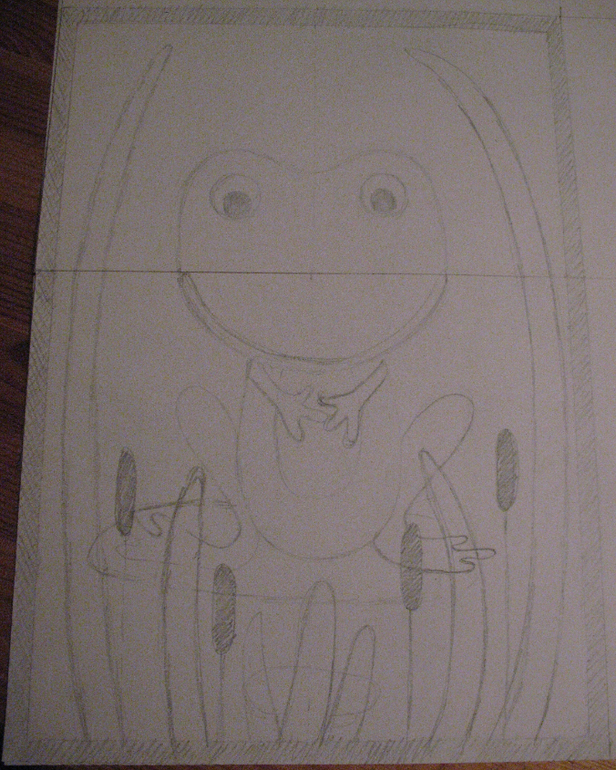 Так как планшет был заказан не стандартного размера 20 см х 20 см, а 25 см х 35 см, тем более фермуар для лягушки был другого размера, чем на страничке из развивающей книжки, то я сочла нужным нарисовать эскиз сюжета для утверждения: