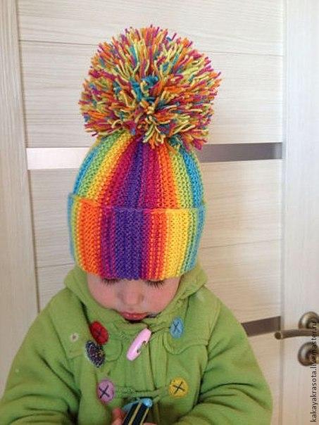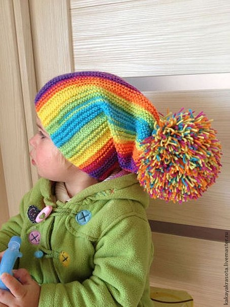 эта шапочка вяжется не ото лба к макушке как обычно, а вокруг головы. Я вязала из разных цветных ниток одной марки. Здесь секционка короткого крашения, не тонкая, вверху просто собирается на нить, в этой модели сделан помпон. Такая шапочка хороша именно длинная, очень интересная и без помпона. ))