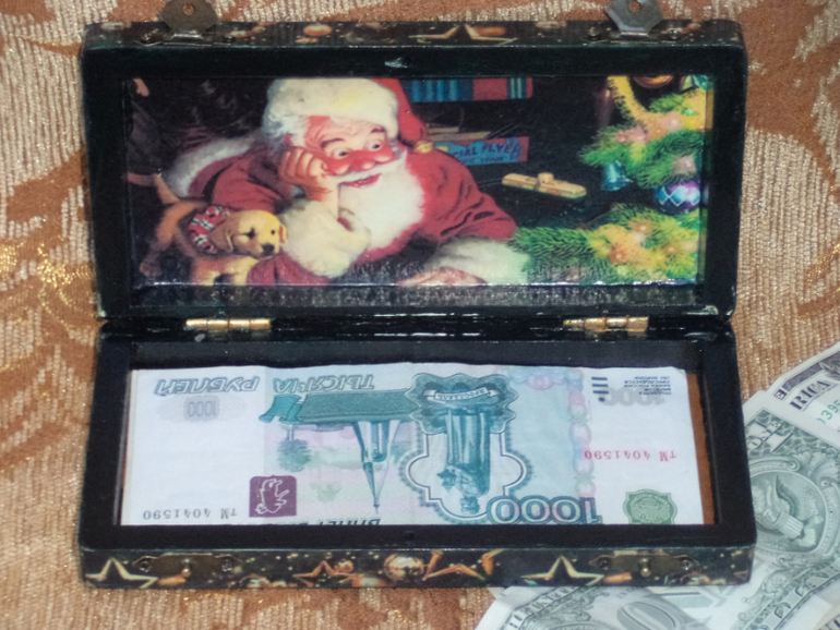 На часах трещенки бы приглушить и совсем не видно цифр. Срочно их выделяй точками или по внутренним ребрам пройдись серебром. Купюрница покорила, дедушка Мороз так задумчиво на денежки смотрит, мечтает о перспективе их потратить
