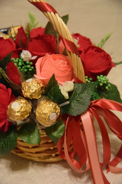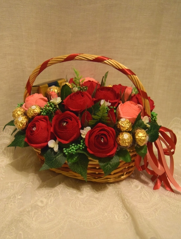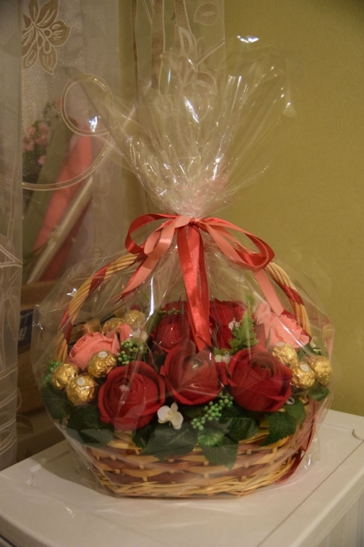 В составе: кофе, 24 шт конфет (Ферреро, Рафаэло), размер корзины 35 на 38 см в диаметре