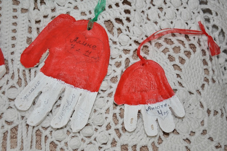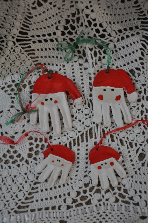 Поделки с детками.Сделали мы с девулями моими дедушек морозов. И получились подарочки в виде игрушек на ёлочку и памятных оттисков ладошечек родных))