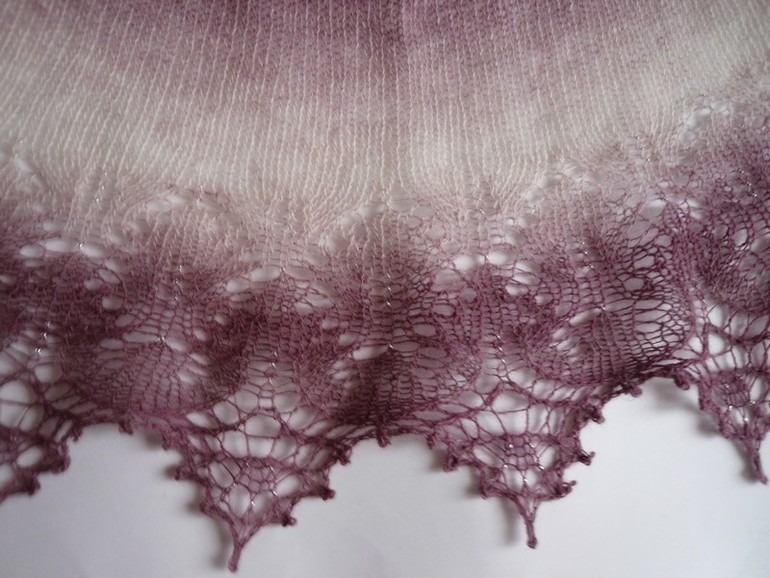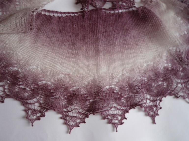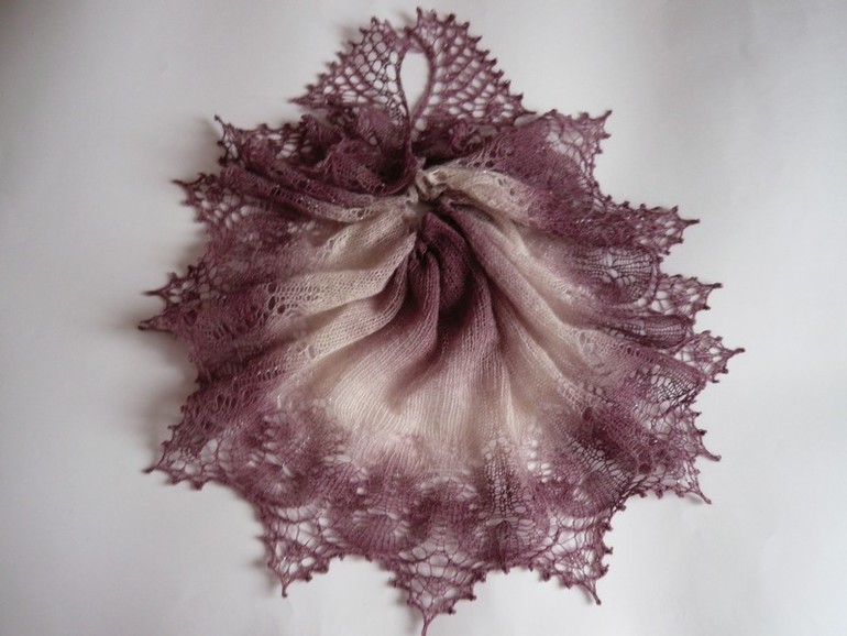 Ниточку по ходу вязки рвала и перематывала. Из пасмы использовала весь сливовый цвет и два перехода к белому. Размер шальки 130 см по ленточке (внутренний полукруг) и 35 см высотой. Шалька больше декоративная - использовать вместо снуда, носить поверх пальто или шубки.