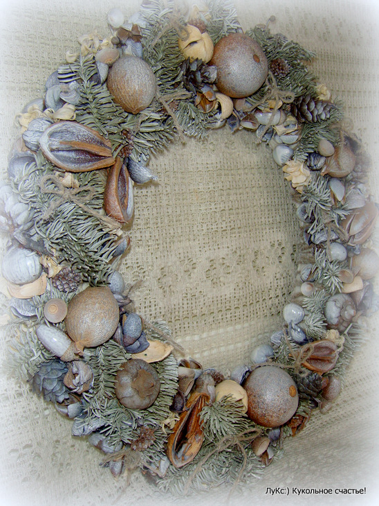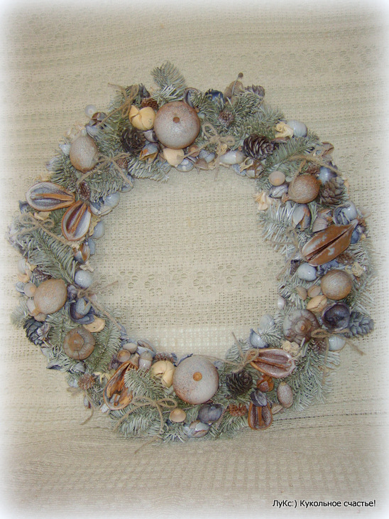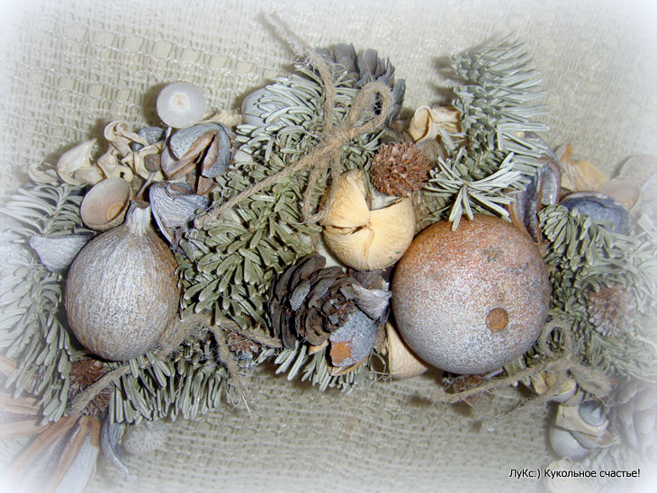Только натур-продукт)) Основа венка из бумаги и бумажного скотча, обвязана джутовым шпагатом. А для декора использовала еловые ветки (остались с прошлогоднего букета, "зеленые" расслабьте булки), шишки (собирала с ребенком), каштаны, орехи, какие-то косточки из икеевских наборов для декора интерьера, желуди (опять же собраны с ребенком), джутовые бантики.