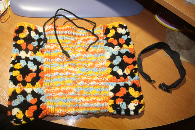 Я решила все же свои долговязы поразбирать и нашла заготовку шарфа-недодела. В итоге вот, что получилось, но старшая говорит, что для ребенка очень грубо:( Хоть и ярко. Веревочки сверху хотела на ручки пустить. И молнию вшить. По размеру папка помещается, еще отпарить и вообще нормально будет.