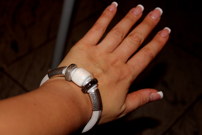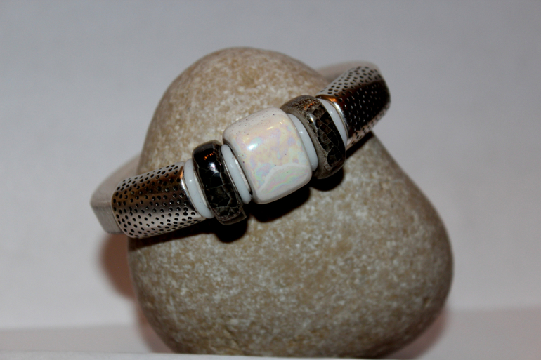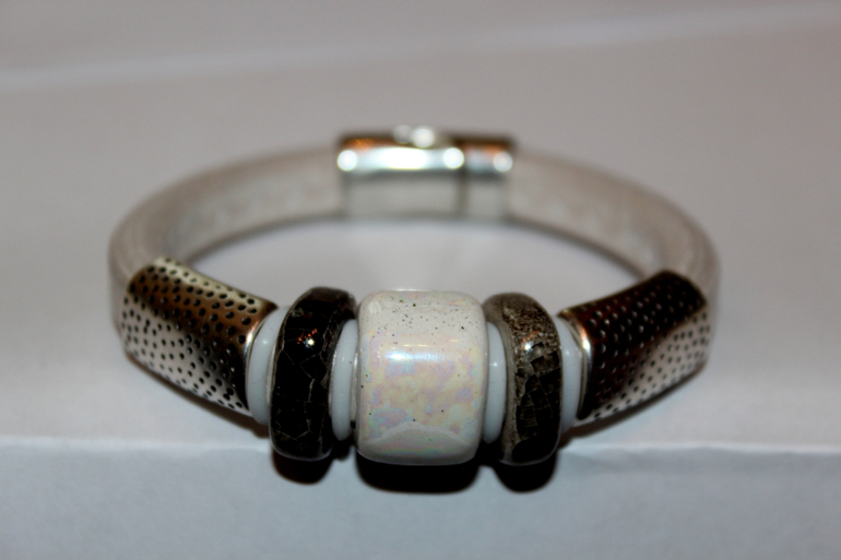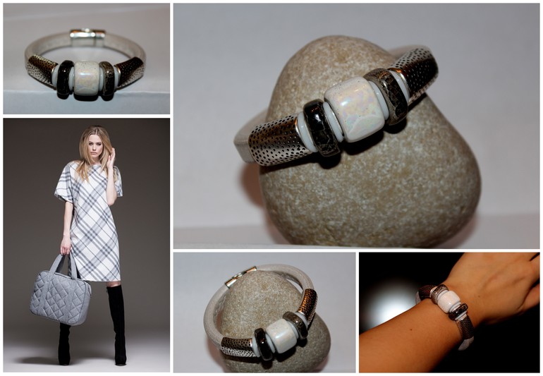 Снежно-белый. Основа - натуральная кожа жемчужного цвета. Керамические бусины ручной работы.