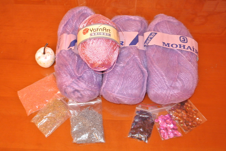 Описание: 3 мотка шерсти "Мохер", 1 моток люрексовой нитки "Ярна", 3 пакетика бисера, 3 пакетика паеток і 1 пенопластовое яблочко, которое можно использовать в декоре + подарочек)