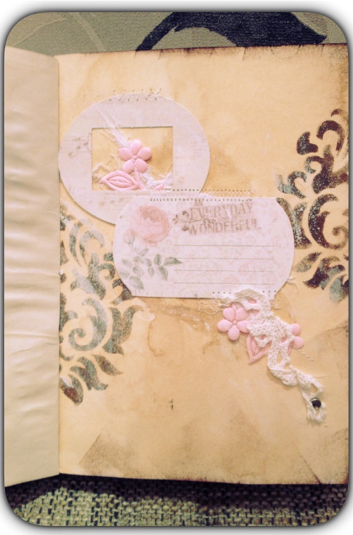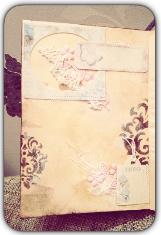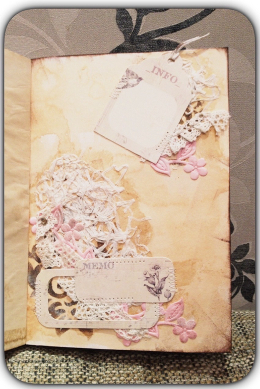 Итак, блокнотик формата А5. Такая смесь шебби и винтаж. Мягкая обложка, коптский переплет, два декоративных разделителя.