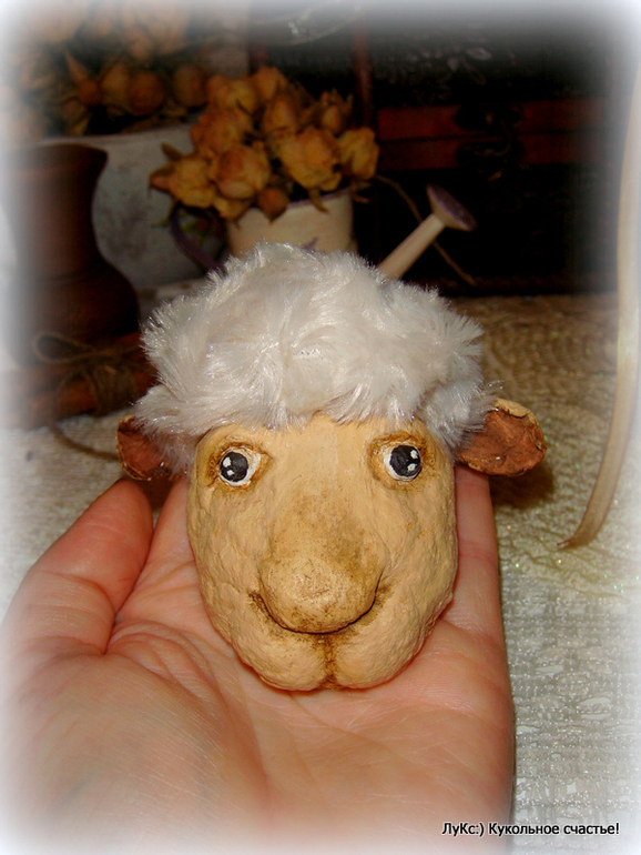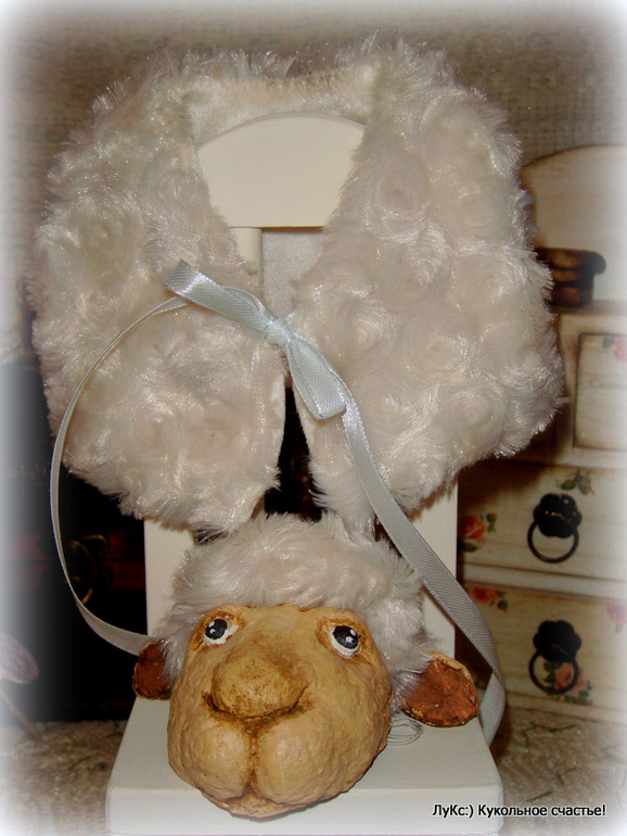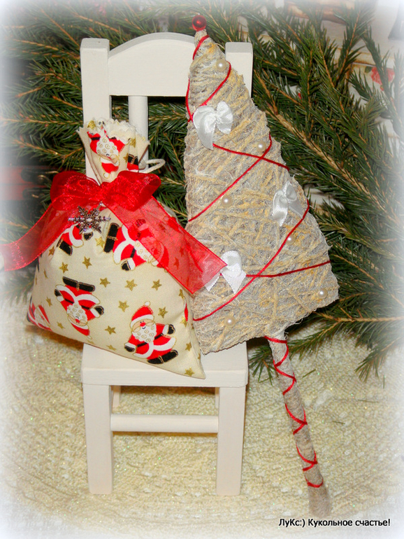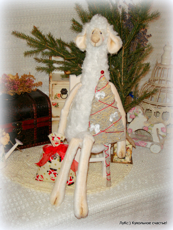 И ее подруга овечка Фортуната (с итальянского - приносящая удачу и везение). Овечка сшита по моей выкройке из микрофибры и искусственного меха, набита синтепухом, в пузе гранулят, глаза-стекло, тонирована маслом. Ростом 60см. Елочка из картона и джута, мешок из хлопка.