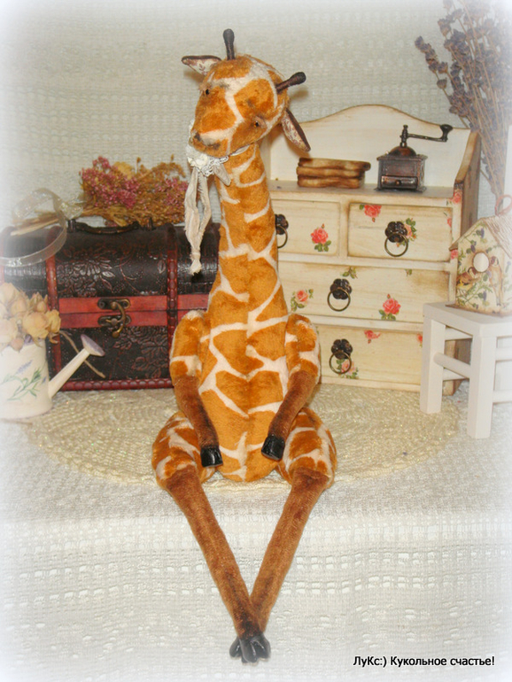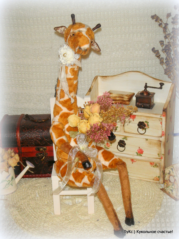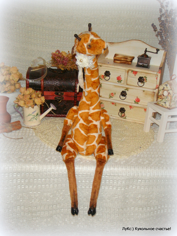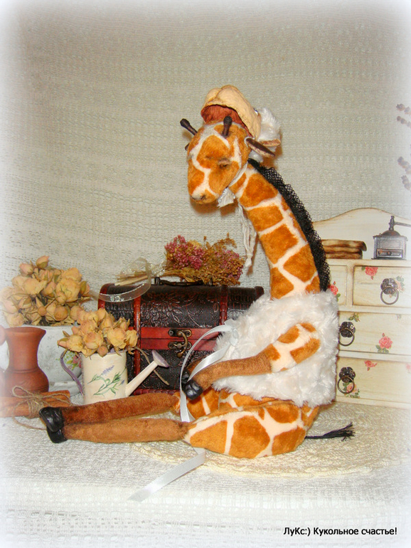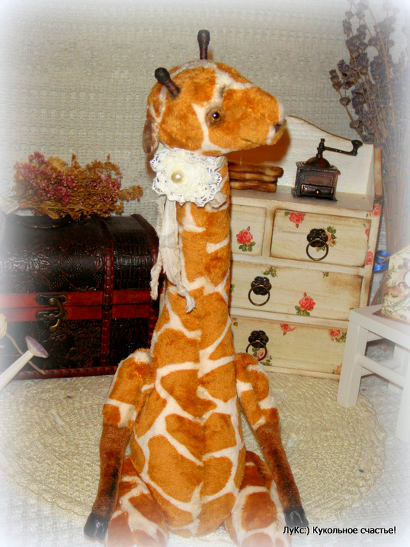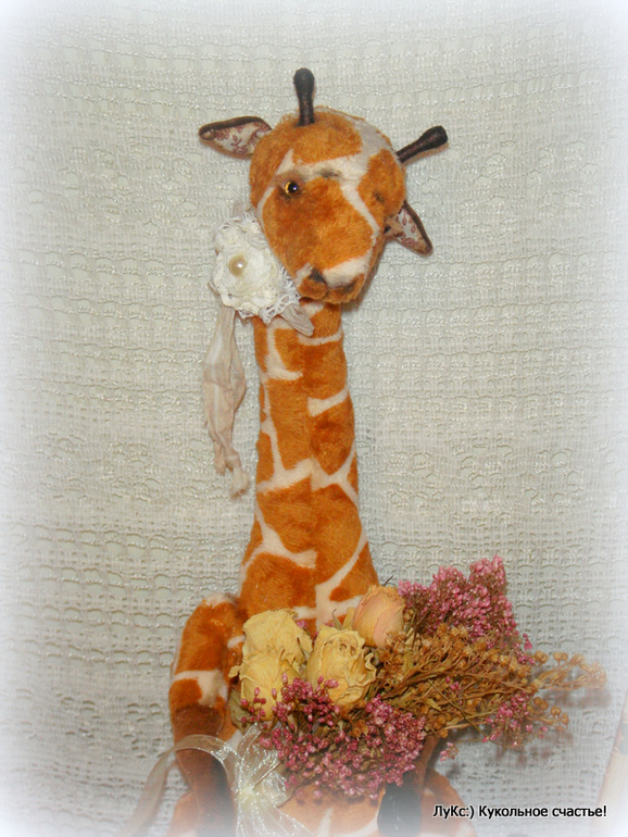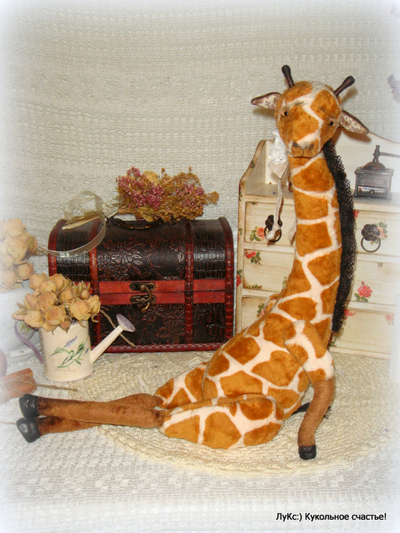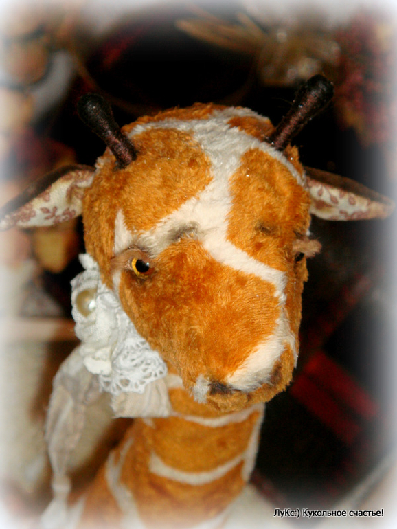 Разрешите представить: тедди-жирафа Аурелия (с итальянского - золотая). Сшита из вискозы и хлопка (выкройка моя), набита опилочками и минеральным гранулятом, в ногах 4 шплинта, в голове еще 2 (качается), глаза-стекло, рога из дерева и ниток, грива из кружева, копыта слепила из Папперклея и покрасила акрилом. Животинка тонирована маслом. Ростом 50см стоя, 30 - сидя)