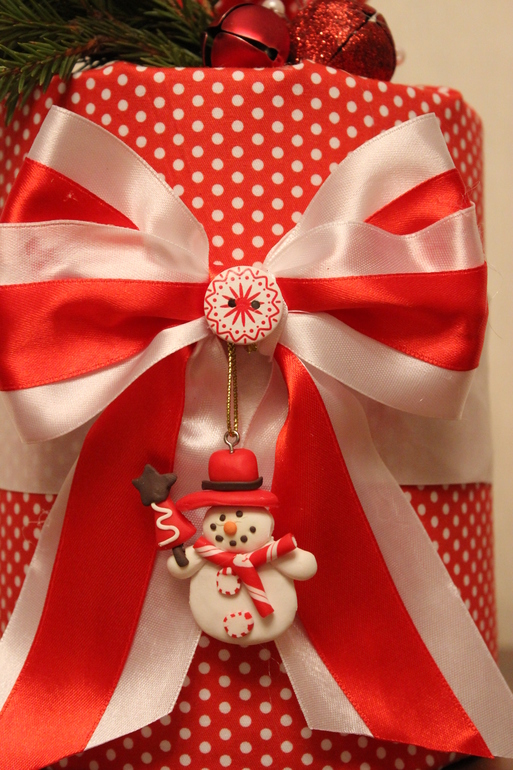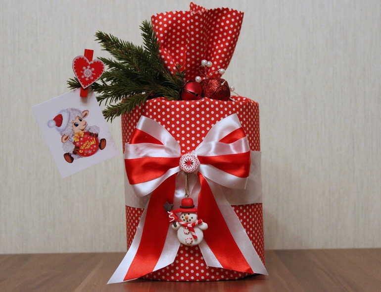 сам подарок - не дорогой, так как был оговорен бюджет ( что бы не было обидно и всем по одной стоимости было). А вот упаковала я в ткань! Не нашла я бумагу такой расцветки (( хорошо хоть в запасах у себя нашла то что надо. Из атласных лент, белой и красной, связала бант, прилепила пуговку. Общипала маленько свою елку. распечатала на обычном принтере картинку, и все. готово!!!