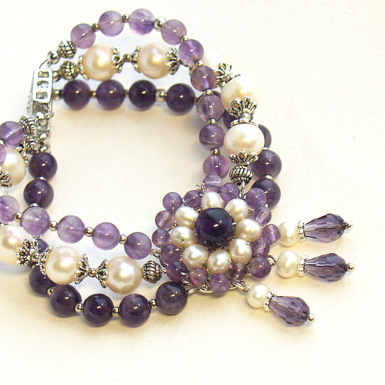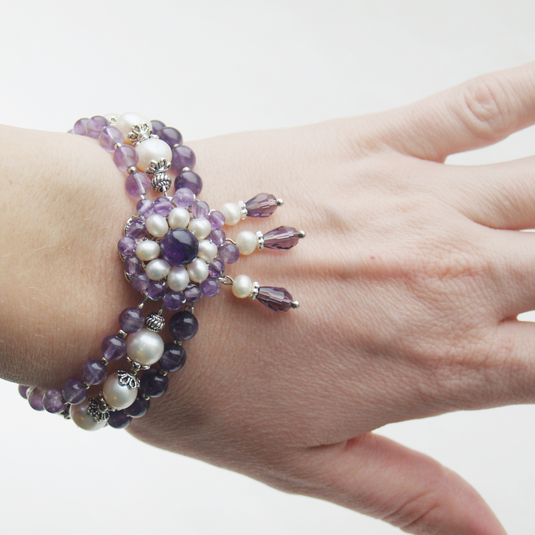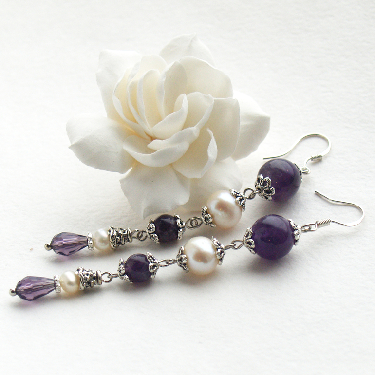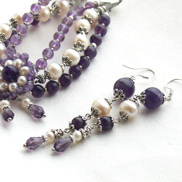 Украшения собраны из аметиста разных оттенков и жемчуга.