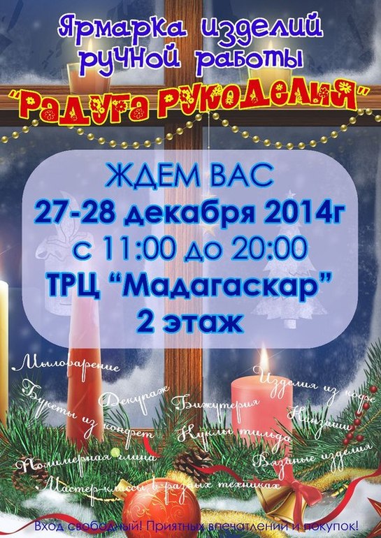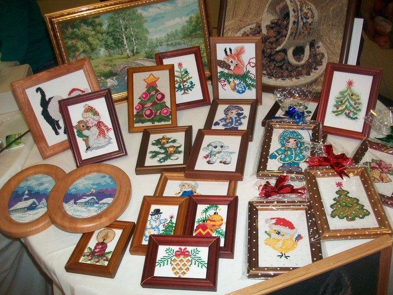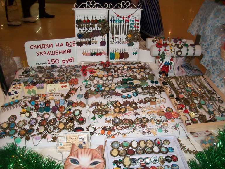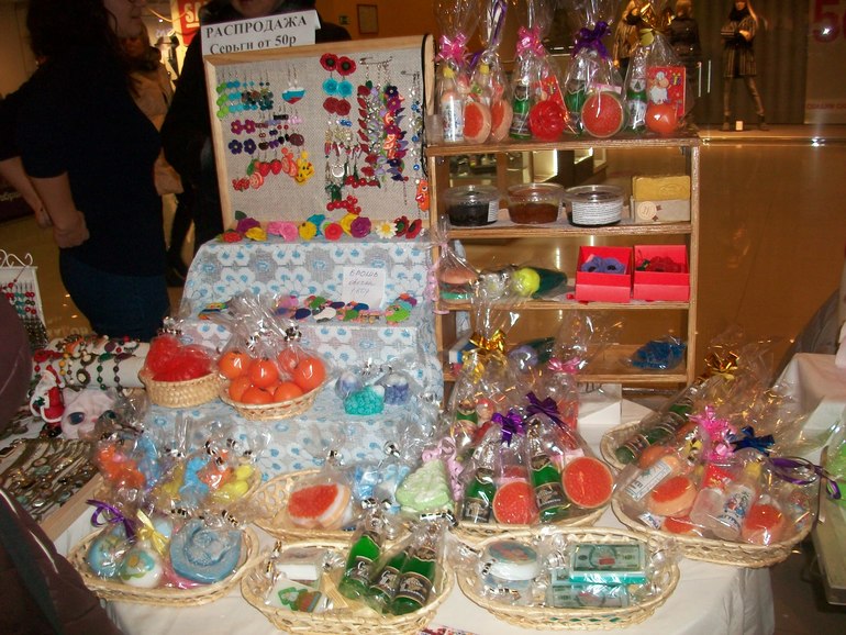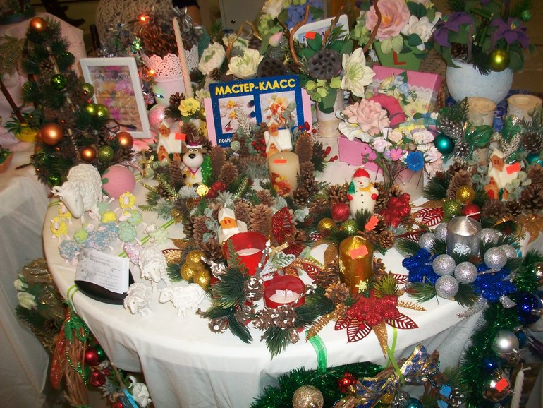Тильды, мыло, украшения, пинеточки, сизалевые елочки, бисерные цветы, канзаши, вышивки, вязаные овечки и праздничный декор. Столько всего! Жаль, не было ничего декупажного, а так хотелось!..