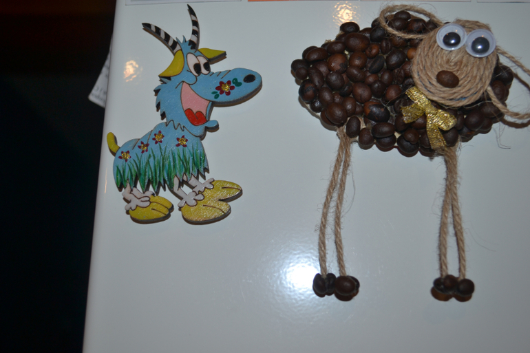 Поделки с детками.Моя Аннушка не очень плодотворно готовилась к Новому году. Такое у нас впервые. Много факторов, которые нам помешали в этом году: это то, что мы пошли в 1-й класс, и то, что Аннушка готовилась 2 месяца к выступлению со своим танцевальным коллективом первый раз на большой сцене в области, и то, что нас замучали девятичасовыми отключениями света. Но, ни смотря ни на что, кое что мы сделали. Это наша козочка (заготовку покупали, а потом раскрашивали), овечка из зерен кофе.
