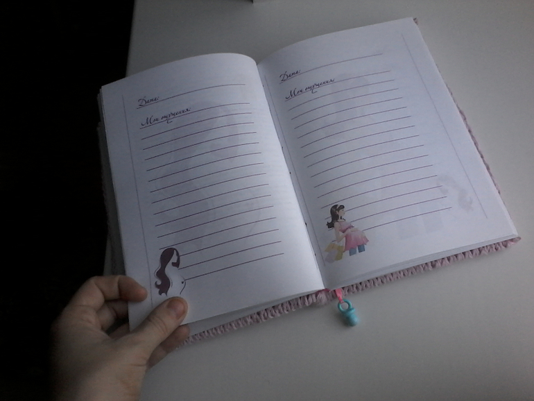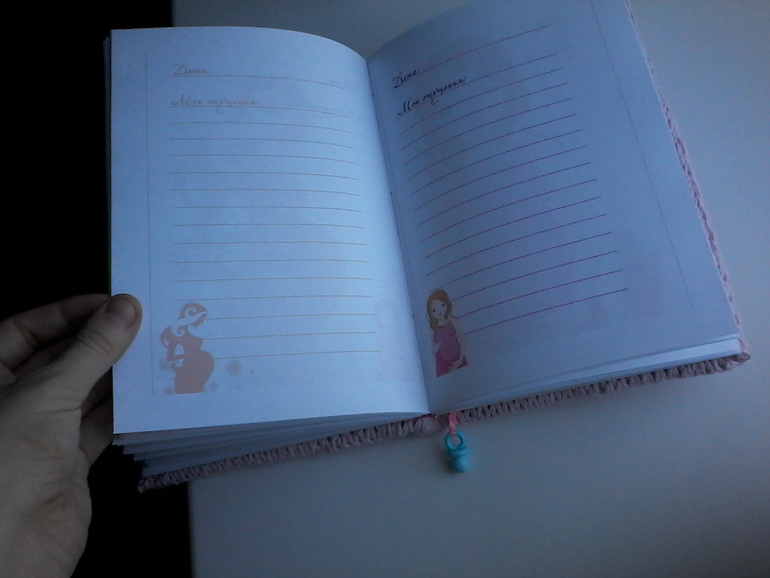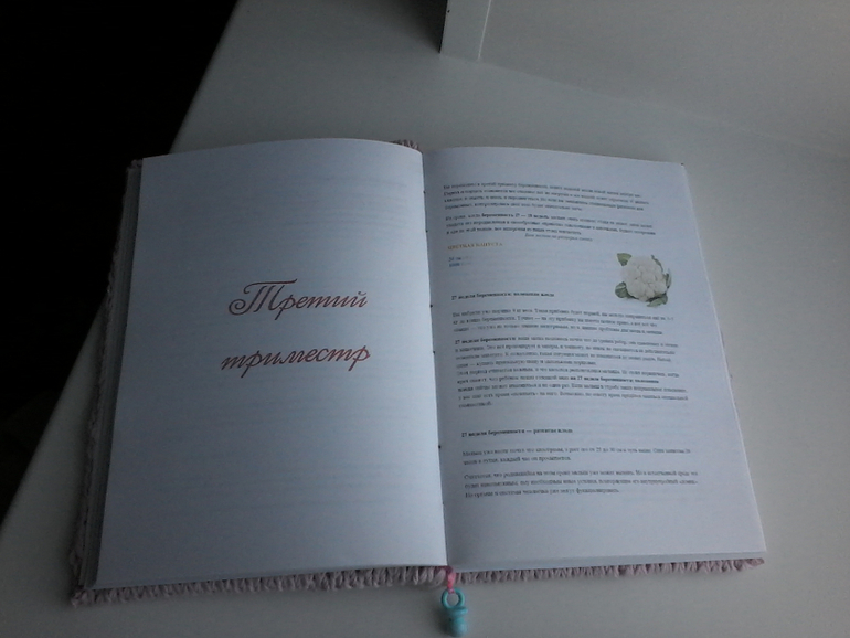 Все триместры расписаны по неделям,после них написан список приданного,зачем и для чего с разъяснениями и пояснениями)))ну а за ними сам блокнот страницки -дата,мои ощущения.мягенький и нежныйдекора по минимуму,чтоб писать удобно было.свободен.