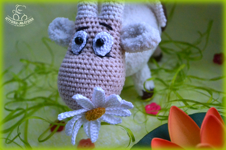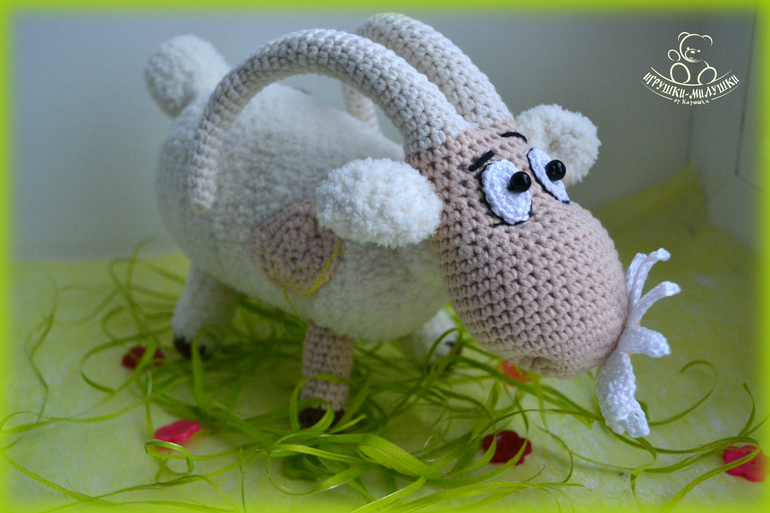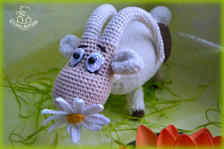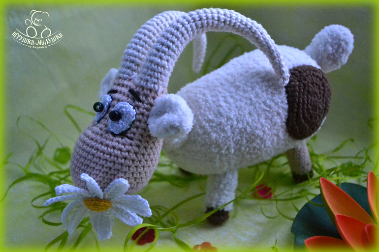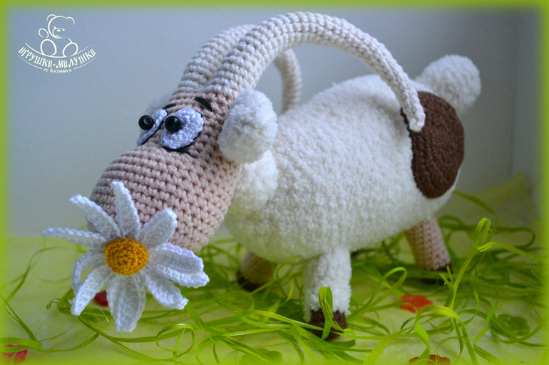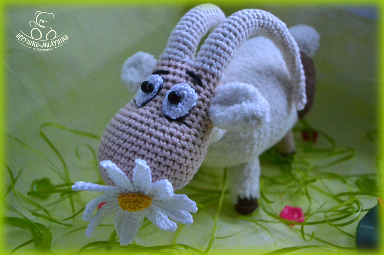 Связана козочка крючком пряжей Джинс и Alize Softy, довольно плотненько набита синтепоном, глазки-бусинки надёжно пришиты, ромашка связана Бегонией - лепестки и Alize Miss - тычинка.