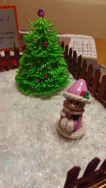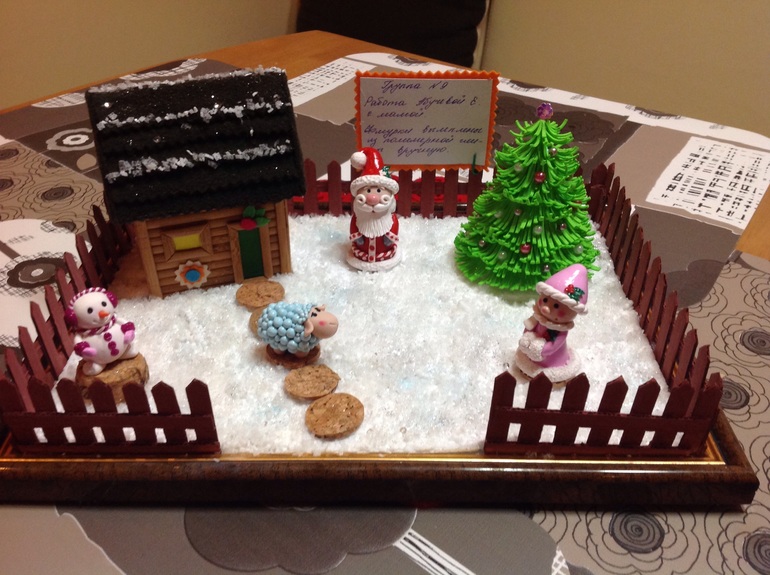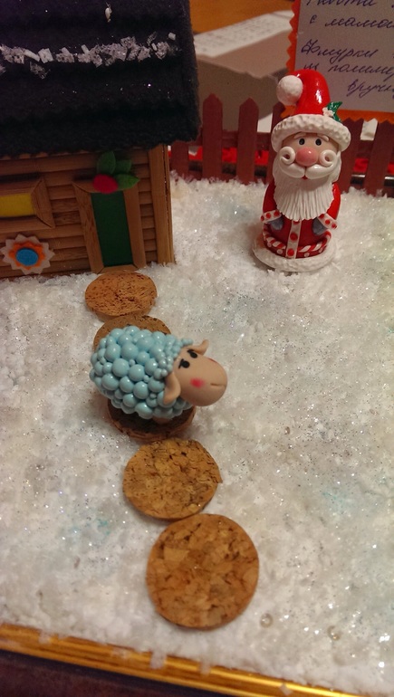 Снежком посыпала,шарики для барашка крутила. По- моему для её возраста этого вполне достаточно. Тем более,что мы дома занимаемся и другими видами творчества. Понятно,что пока сама она не сможет сделать что- то такое ,что бы это не выбросили после праздников. А поделку я делала из того расчета,что бы её не выбросили ,а оставили в группе , и дети смогли бы полюбоваться.
