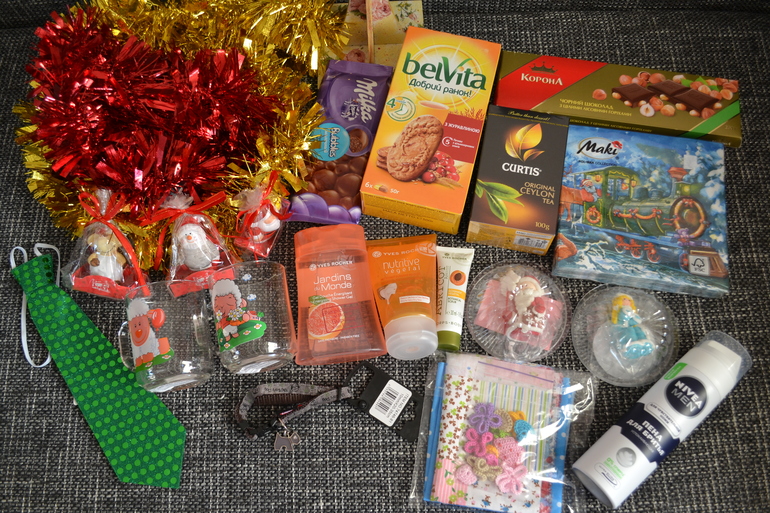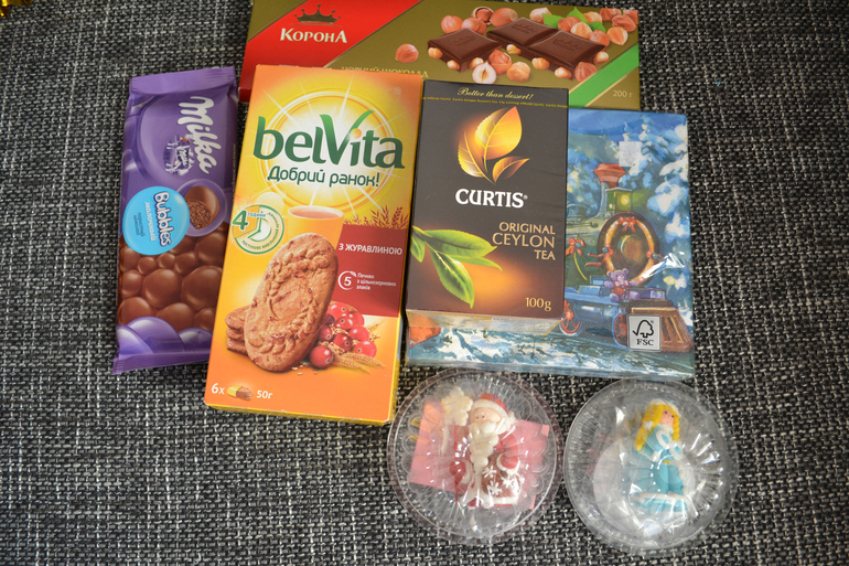 Общий вид (но... сохраню интригу, ведь есть ещё главный подарочек-рукодельный из-за которого и затевался обмен)) тут и вкусняшки всевозможные - печеньки, шоколадочки и мой любимый чаёк! (ты прям как знала))) и салфеточки для новогоднего стола и марципановые Дед Мороз и снегурочки - обязательно попробуем)))