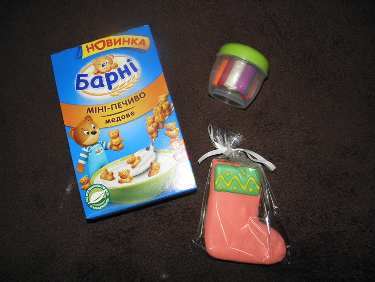 А вот подарочки от Катуси-Снегурочки для Васюши)печеньки Барни,масса для лепки и нарядный пряничек))