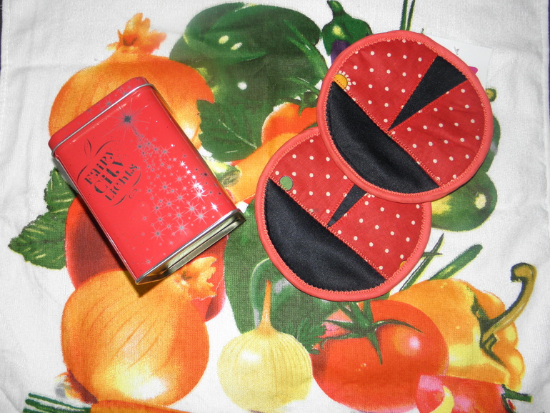Но это ещё не все мои подарочки!ещё подарочки для меня-хозяюшки!тут чудесные прихваточки-божьи коровки,которые Катуся сотворила своими золотыми ручками,полотенечко с "вкусной" кухонной тематикой и красивая жестяная баночка(я ж большая любительница всяческих баночек-коробочек)