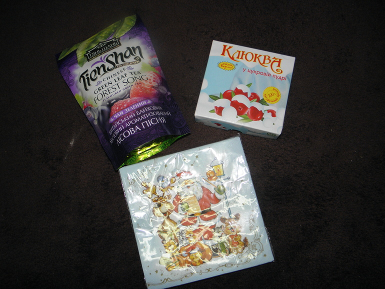 Ну и конечно к первому январскому чаепитию чаёк,полюбившаяся нам клюковка и праздничные красивые салфеточки!