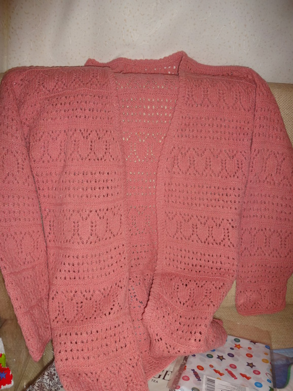 И кардиганчик, такой мииилый, ажурный, очень аккуратной вязки! Нитка такая интересная, поблескивает, искрится, жаль - на фото не видно.