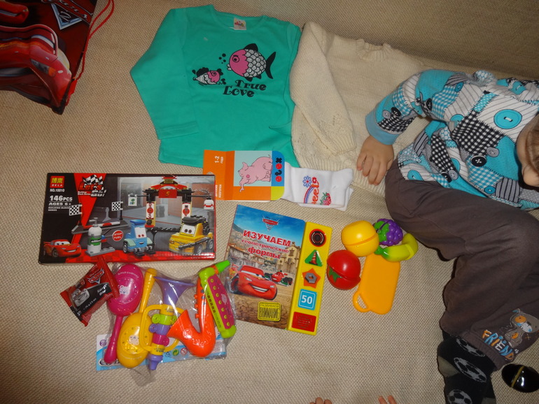 Подарки деткам: книжка и фрукты пользуются бешеной популярностью у обоих :))) Конструктор завтра будем собирать, кроватку уже собрали, сломали, починили и куклы в ней спят непереставая :))) А за музыкальные инструменты от соседей отдельное спасибо :)