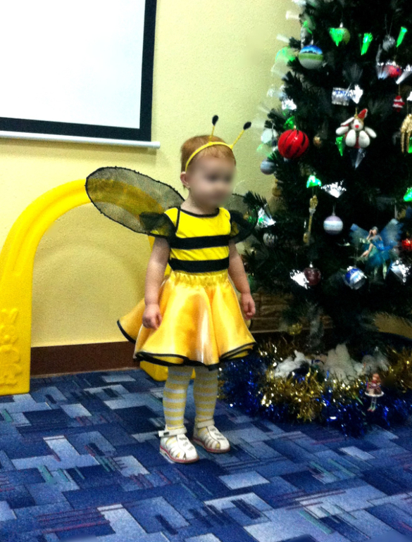 Не судите строго, шила за 3 вечера "с нуля", т.е. без выкроек, без готового полосатого трикотажа, просто имея отрез огранзы, атласа, купленную мужскую желтую футболку и остатки черного блестящего трикотажа, ну и расходные материалы)) обошелся мне костюм рублей в 700-800. Крылья - это отдельная песня, в магазинах только крылья бабочек, пришлось уже придумывать самой из того, что дома было)))) больше похожи на крылья мухи, но в жизни у пчел примерно такие крылья и есть